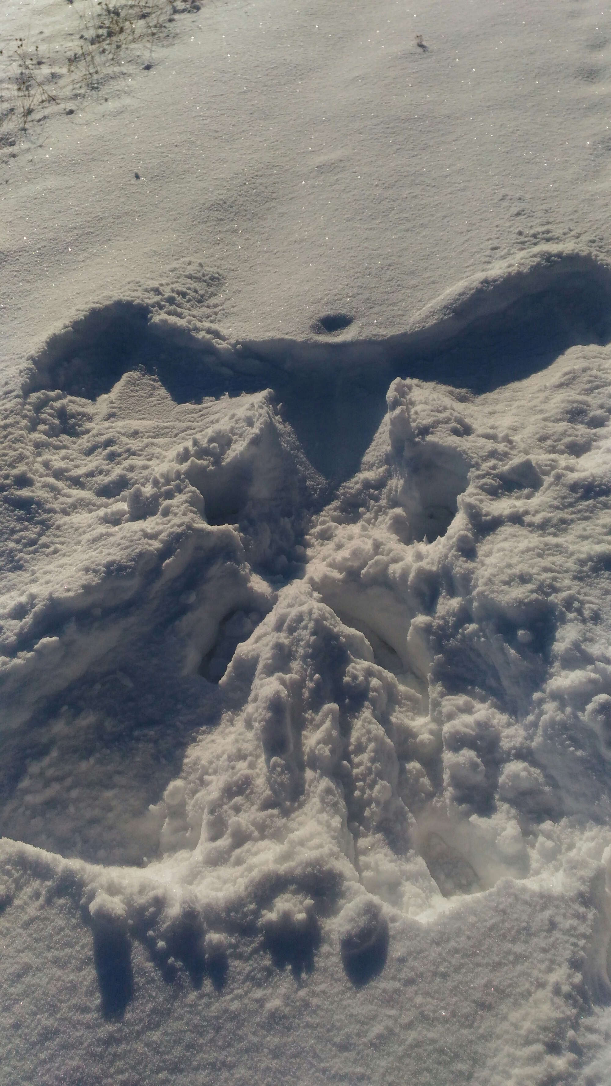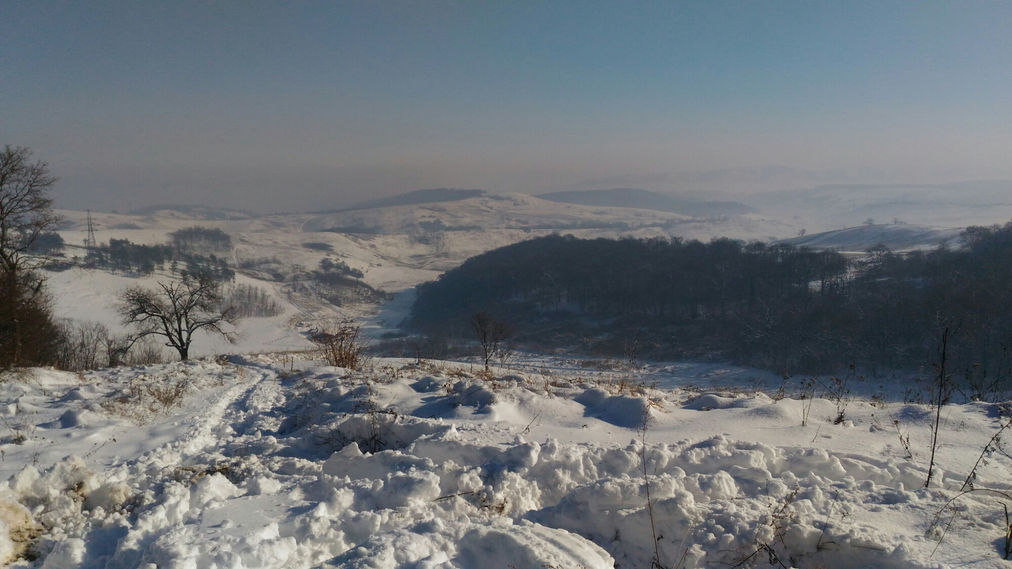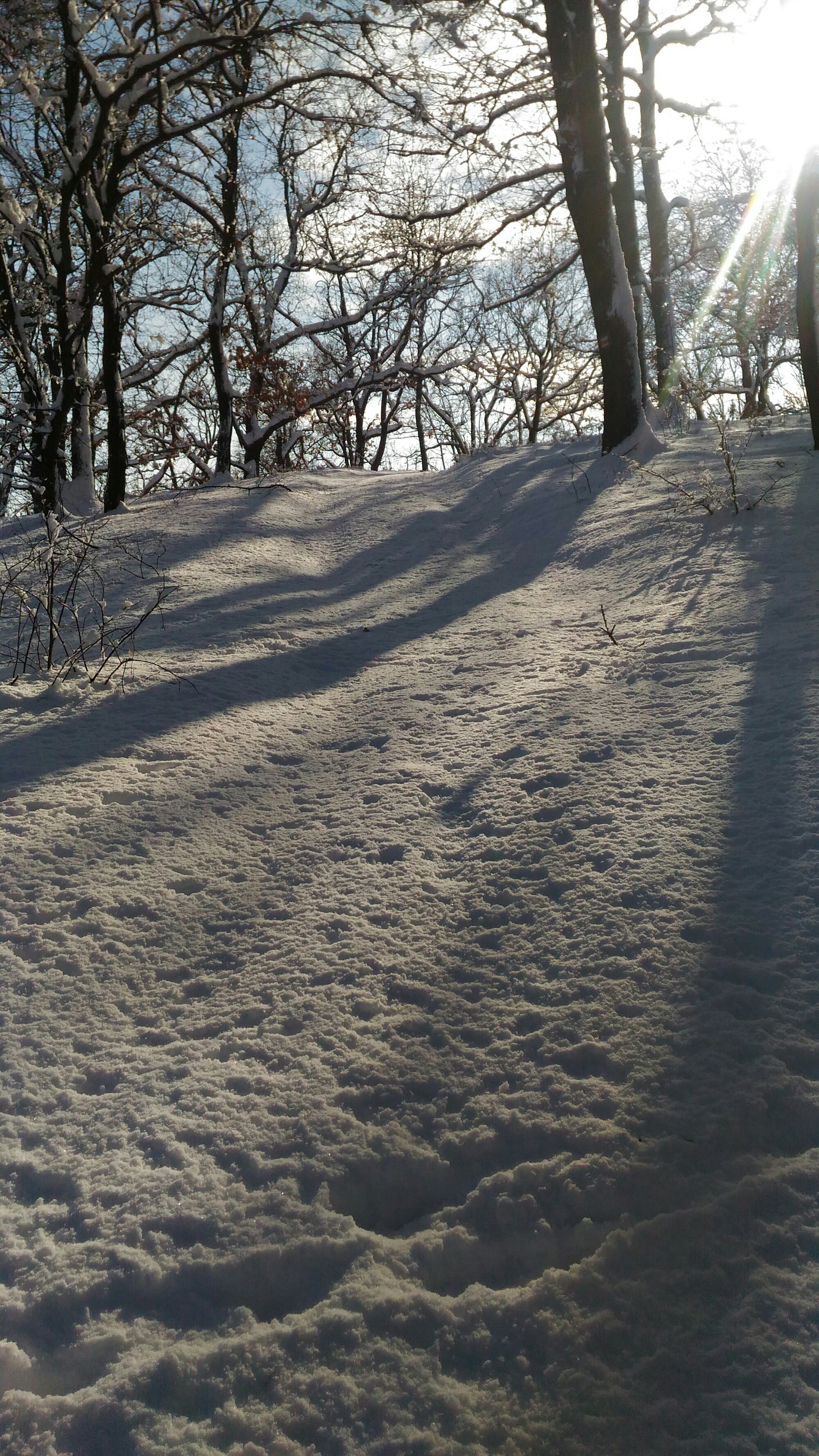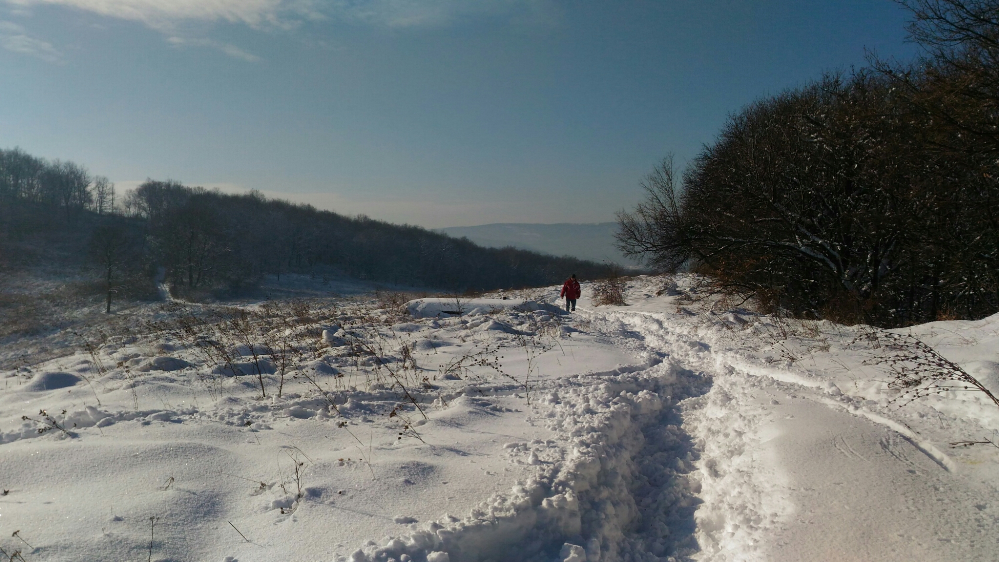 Mire letusoltam, a párom is betoppant. Beszélgettünk egy kicsit (én pihentem, ő meg kiheverte a busz hidegét), majd felkerekedtünk a gyönyörű napsütésben, és egy bő két órát túráztunk a hóban. Feltrappoltunk a dombtetőre, majd folytattuk utunkat az alig járt piros turistaúton. Egy idő után már tényleg csak a szűz havat törtem (én voltam a kamáslimmal a hótörő). De a látképért mindent. Egyszer csak éreztem, lemarad mögöttem. Hátrafordulva láttam, hogy kezd leöltözni. Tudtam, mire készül, de folytattam utam, mert fotózni akartam, meg pisilni. Onnan láttam, hogy tényleg megfürdött a hóban. Az ötletet remeknek találtam, s magam is nekivetkőztem. Csak arról feledkeztem meg, hogy én alul jobban beöltöztem, mint ő, s nekem macerásabb lesz a cuccaim felvétele, mint neki. De ha a fejembe vettem a dolgot, meg is tettem. Segédletével megszabadultam a bakancsaimtól is, majd belevágtam magam a hóba egy hóangyal erejéig. Aztán gyorsan talpra álltam. Ott kezdődött a java! A lábaim pillanatok alatt lefagytak, s amíg legalább az atlétát nem kaptam magamra, csak kapkodtam a levegő után. A fagyni készülő ujjaimmal alig tudtam a lábaimra húzni a lábfej nélküli harisnyát, majd a hosszú szárú zoknikat. Amint bedugtam a lábaimat a bakancsaimba, már nyugodtabban és könnyedebben öltözködtem tovább. Jó buli volt, bár rövid. Bármikor újra belevetném magam a hóba, csak legyen mire állnom utána a havon kívül.